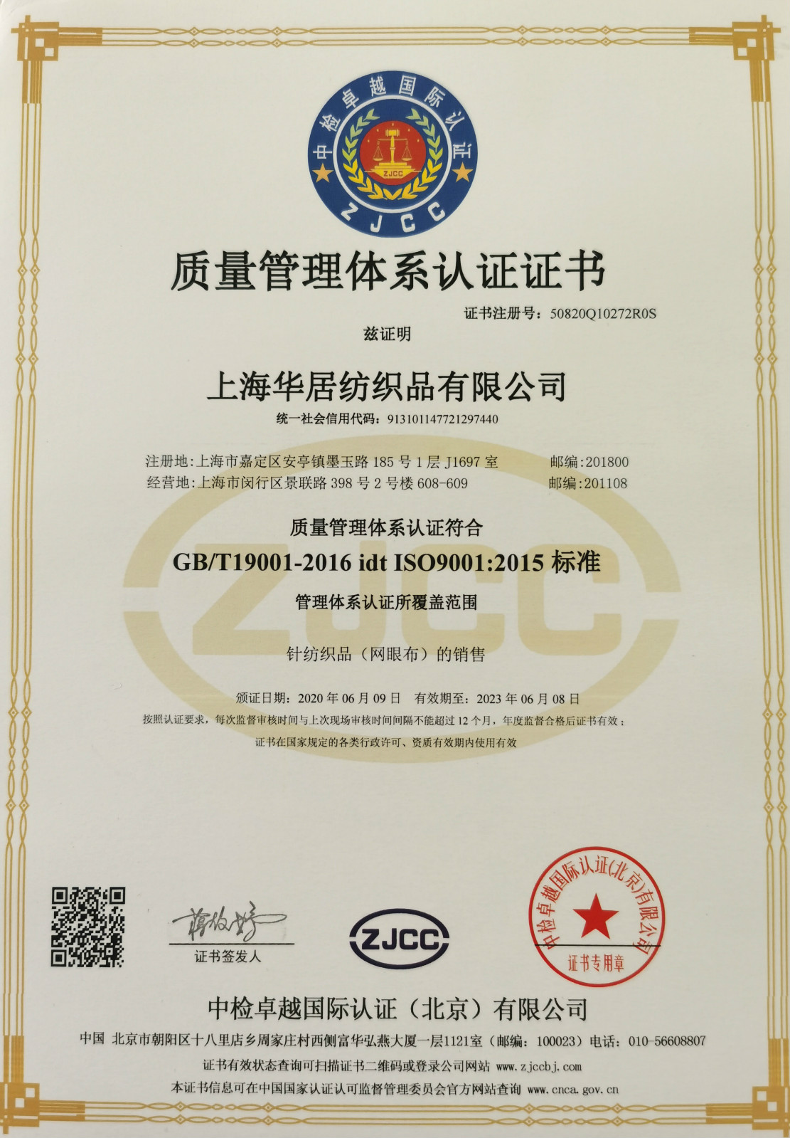2020年6月9日,上海華居紡織品有限公司通過ISO質(zhì)量管理體系認(rèn)證